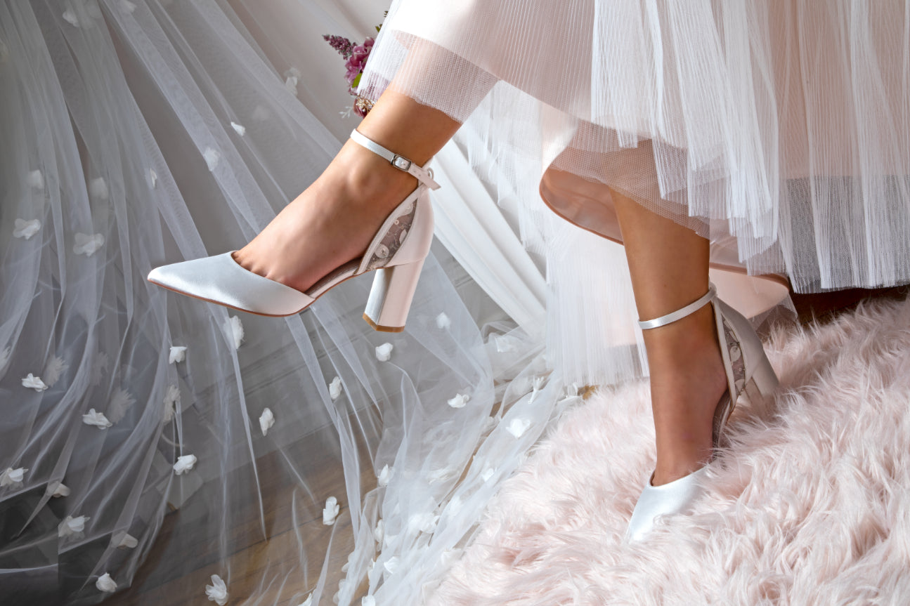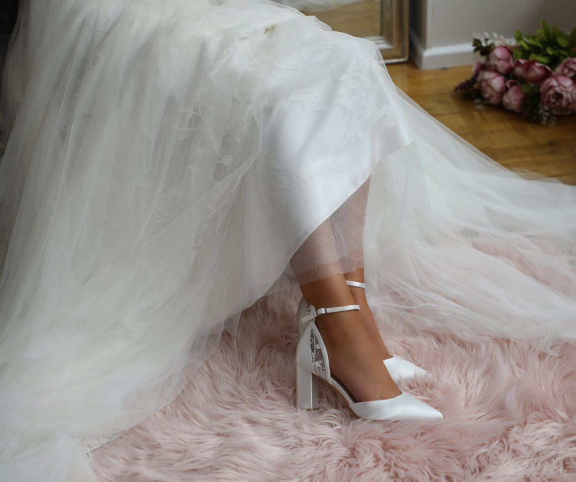 Der Brautschuh Indie kombiniert Style auf Komfort. Schuhspitze mit eleganter spitze. Das Riemchen gibt den perfekten Halt. Raffiniertes Cut-Out an der Ferse, mit Spitze liebevoll unterlegt. Die Spitze ist mit feinen Pailletten und Perlen verziert. der Schuh hat einen bequemen Blockabsatz von 7,3 cm. Für einen Bequemen gang sorgt die gepolsterte Innensohle die Hautfreundlich mit Natur-Leder bezogen ist sowie die griffige Schuhsohle