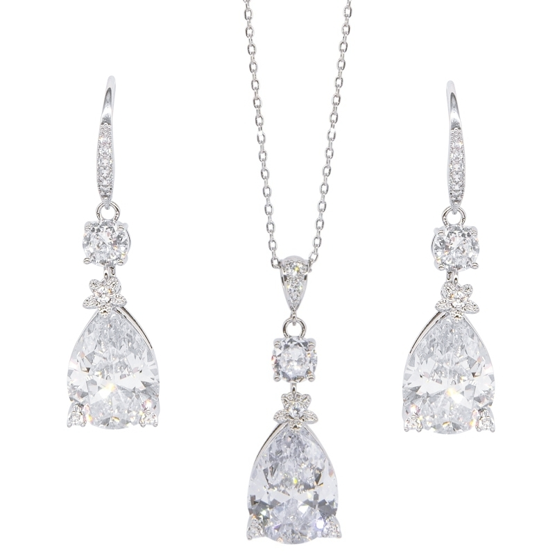 Dazzling Starlet Halskettenset – komplett mit passenden Ohrringen im stilvollen Design – mit funkelnden Zirkonia-Kristallen und einem Kristallblumendetail, das dem Set einen Hauch von Vintage-Charme verleiht. Die ca. 5 cm langen Ohrringe und die verstellbare Kette sind mit 18 Karat Weißgold plattiert, was für eine luxuriöse und zeitlose Optik sorgt.